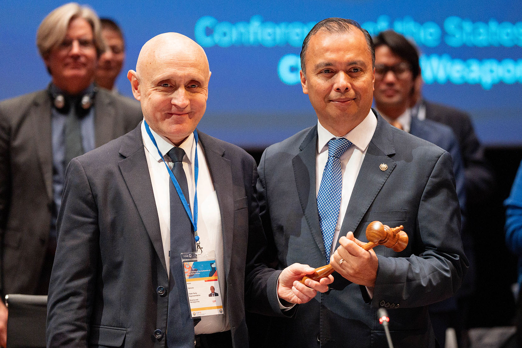 H.E. Mr Almir Šahović, outgoing Chairperson of CSP-29 and Permanent Representative of Bosnia and Herzegovina to the OPCW, and H.E. Mr Agustín Vásquez Gómez, Chairperson of CSP-30 and Permanent Representative of the Republic of El Salvador to the OPCW