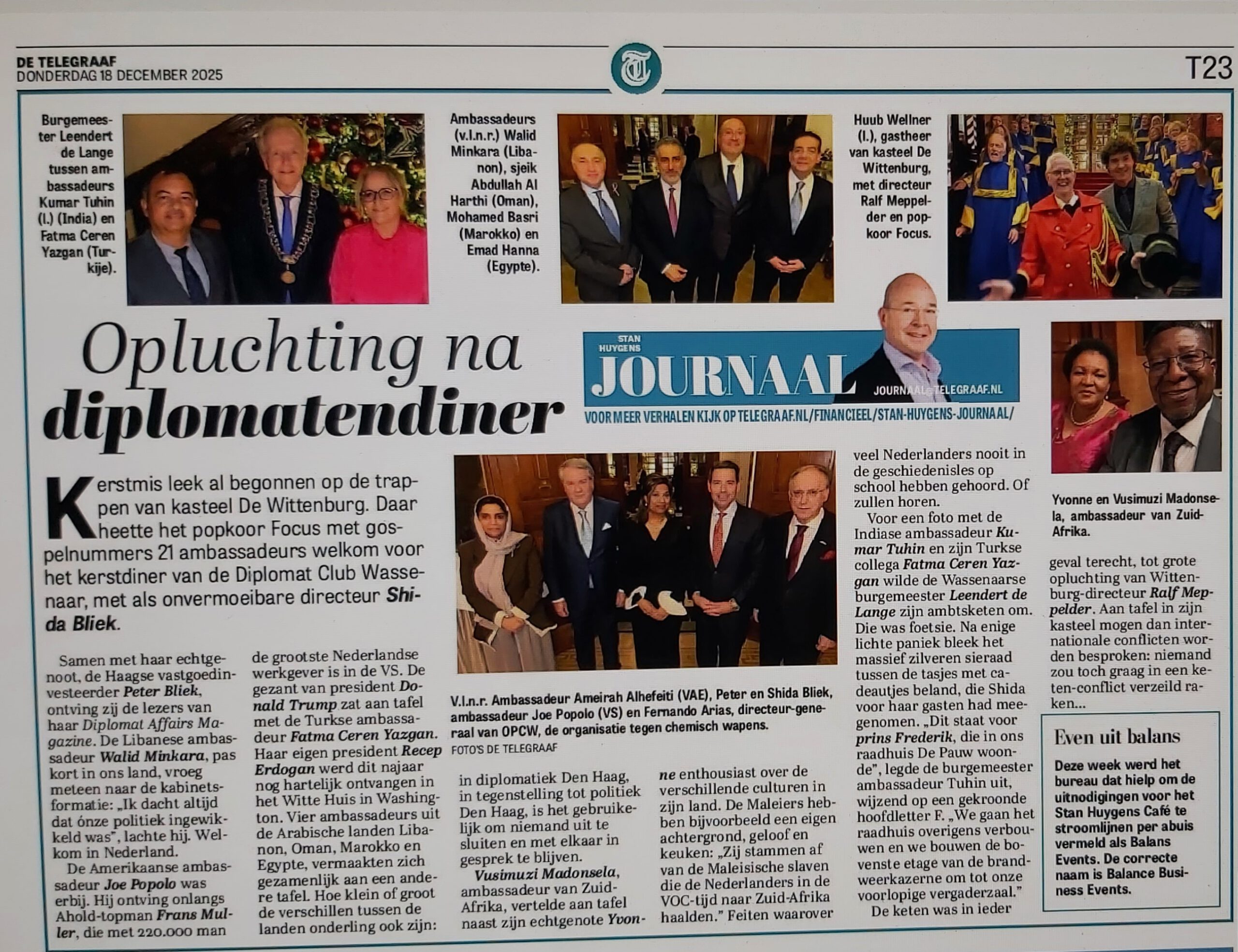 As conversations unfolded in many languages and a festive, yet intimate atmosphere filled the castle rooms, the guests reflected on a year of engagement, cultural exchange, and shared milestones. The gathering stood as a fitting close to the diplomatic year—celebrating unity in diversity, honouring leadership and tradition and strengthening the bonds that lie at the heart of Diplomat Club Wassenaar.